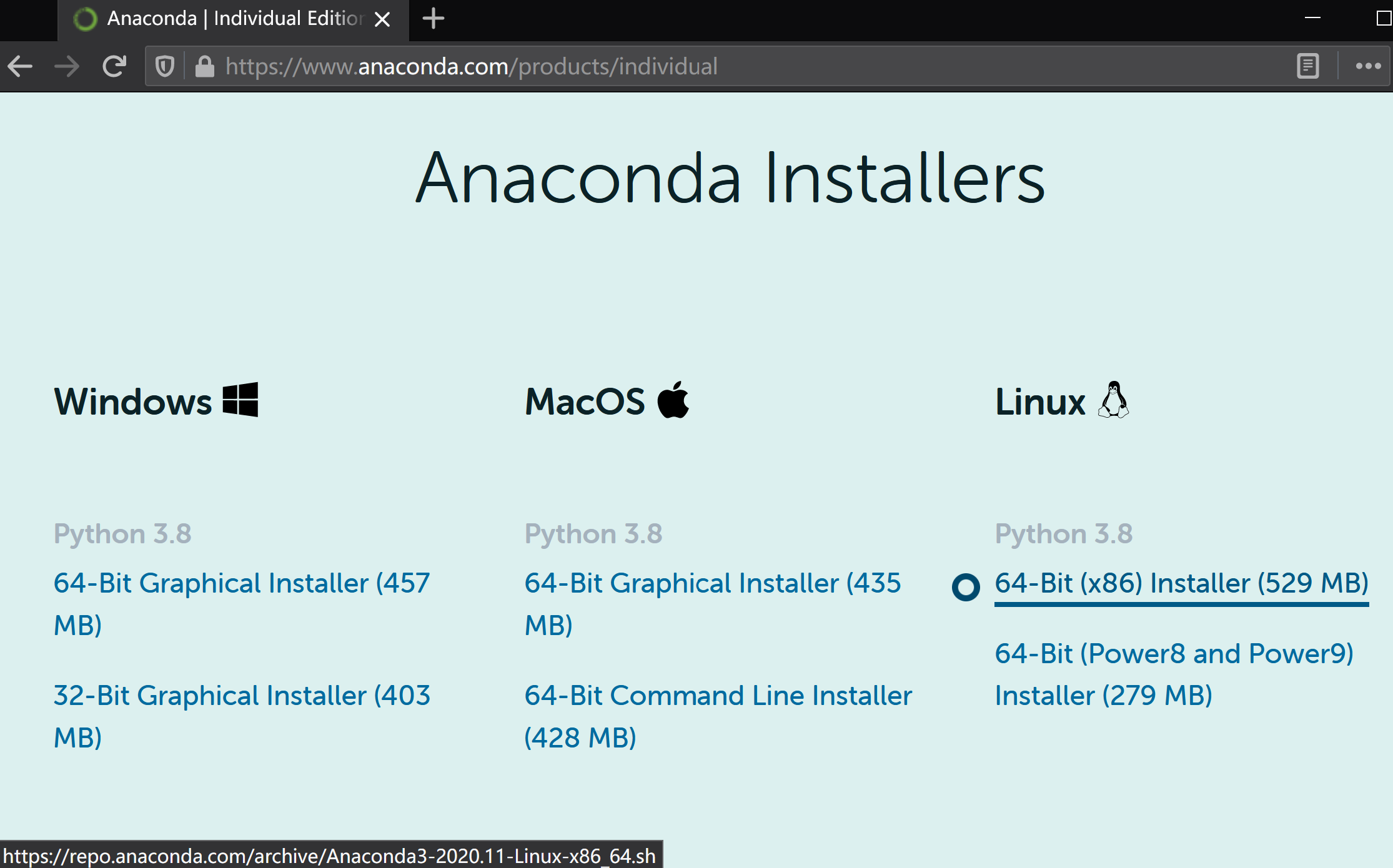我笔记本的开发环境也是使用anaconda,主要考虑到包管理和环境全面,还能装一些非python体系的包简化配置流程(例如libpython、graphviz),安装时首先在anaconda官网找到下载的链接地址,