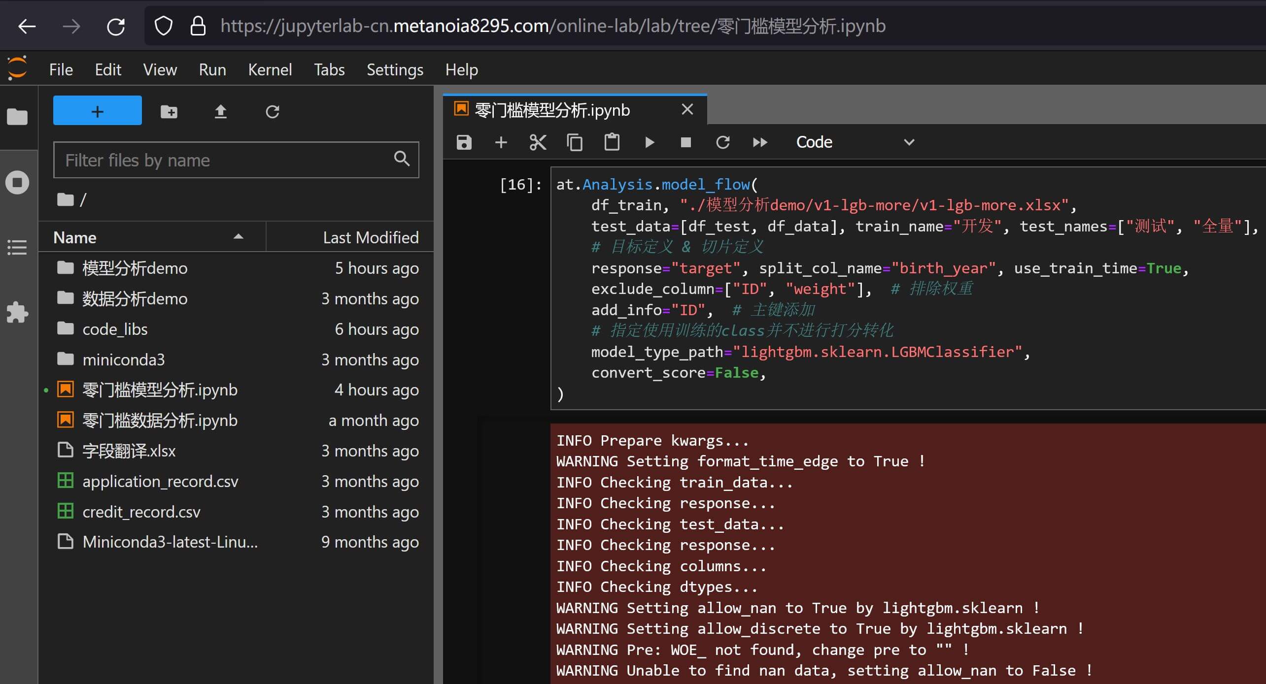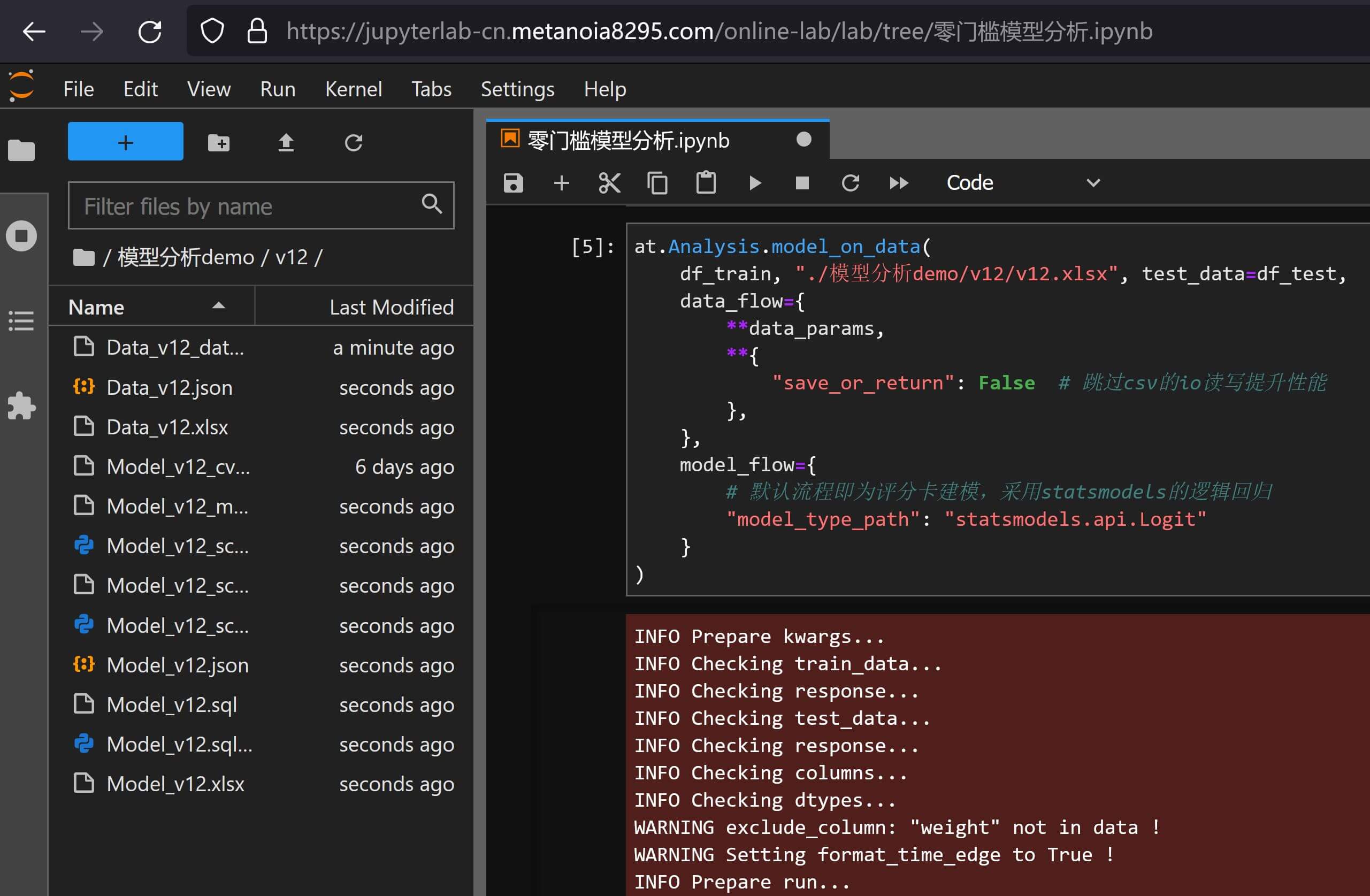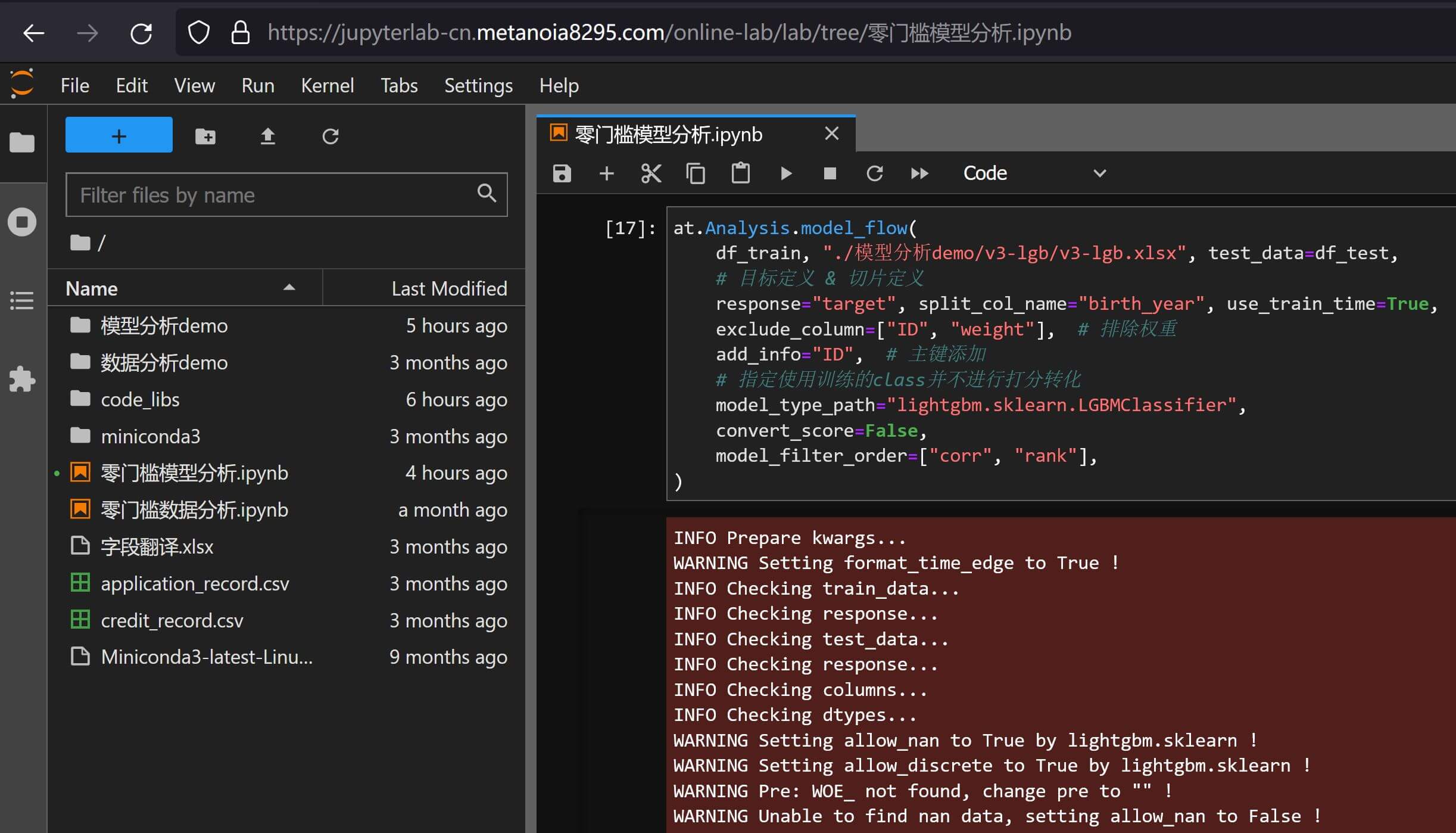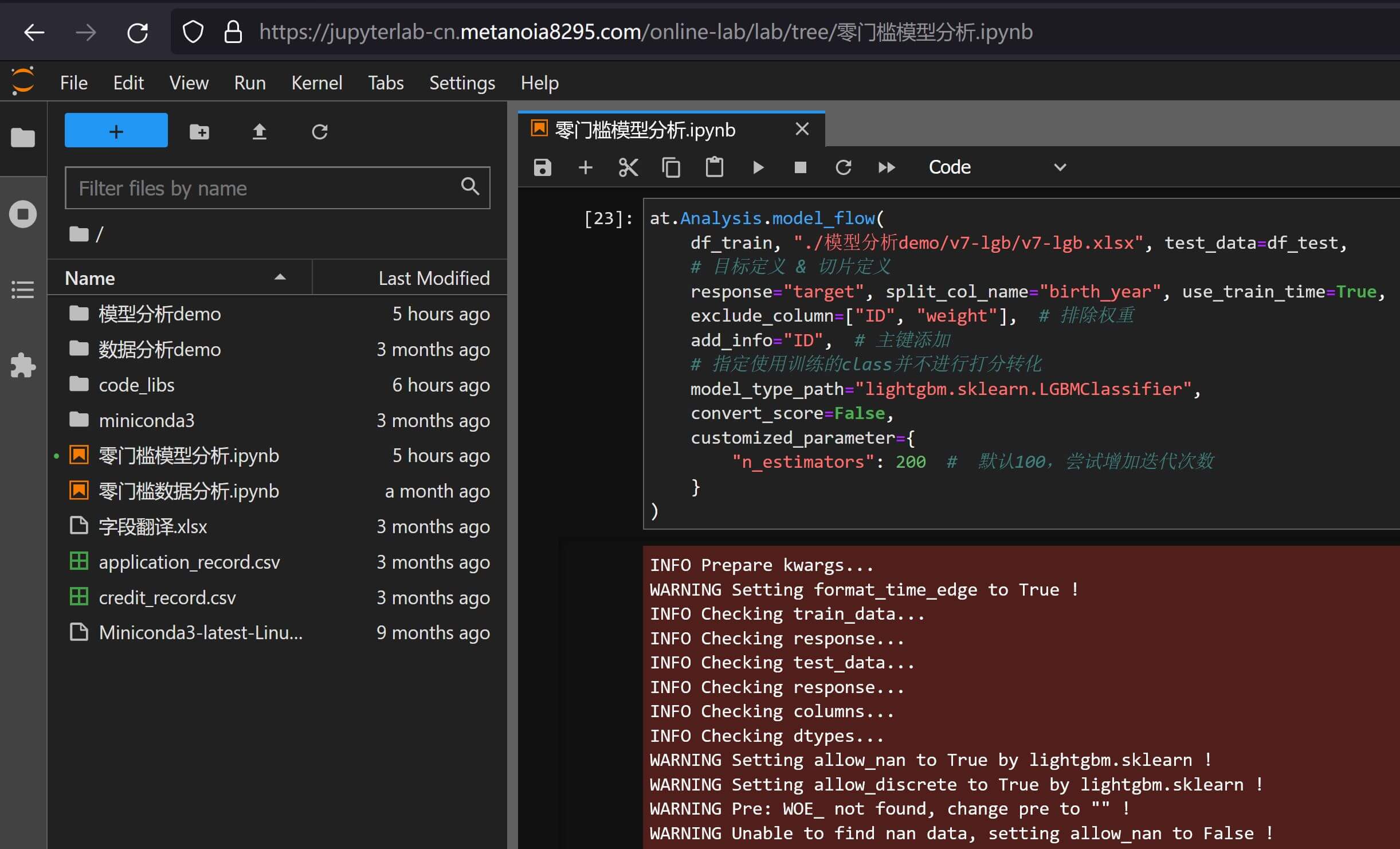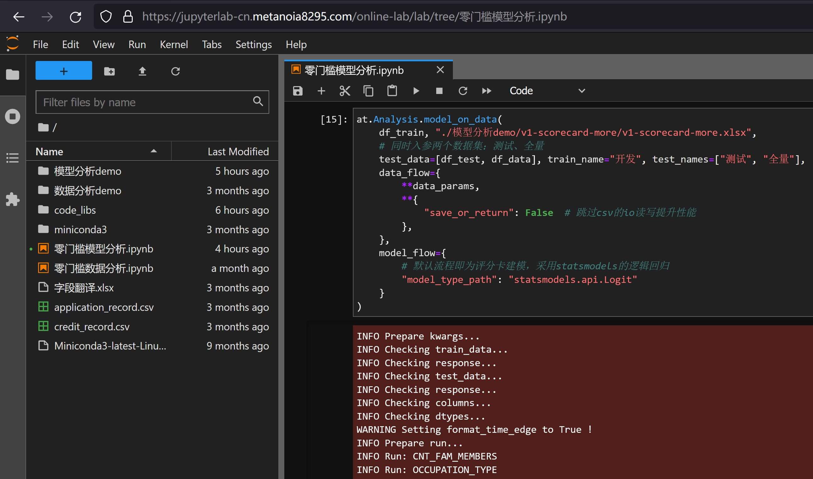 建模案例可见本节1.4 案例展示中的:1.4.1 评分卡建模1.4.2 机器学习建模,另外,写这一篇章时升级了jupyterlab的环境,启用了新的cdn并使用nginx路径分流,所以本文的截图中看到的web路径会和上一章不一样