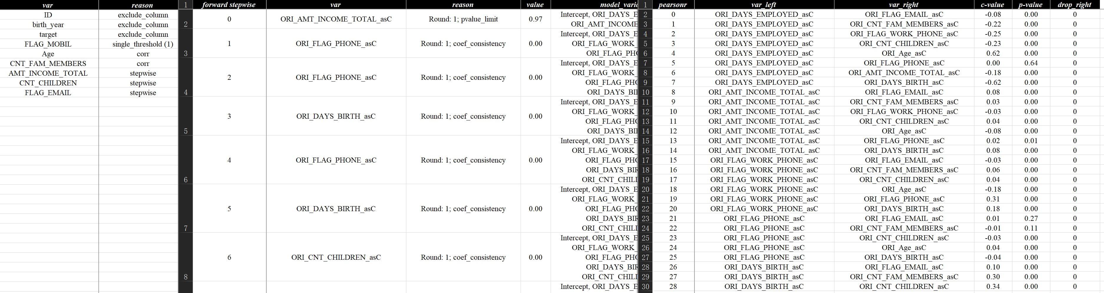 评分卡建模是非常经典的风控建模流程,这里继承零基础实现高质量数据挖掘(数据分析篇)- 5.7 分箱搜索和过滤数据分析报告v12.xlsx的分析参数,展示一下参数化评分卡建模流程,参考代码如下: