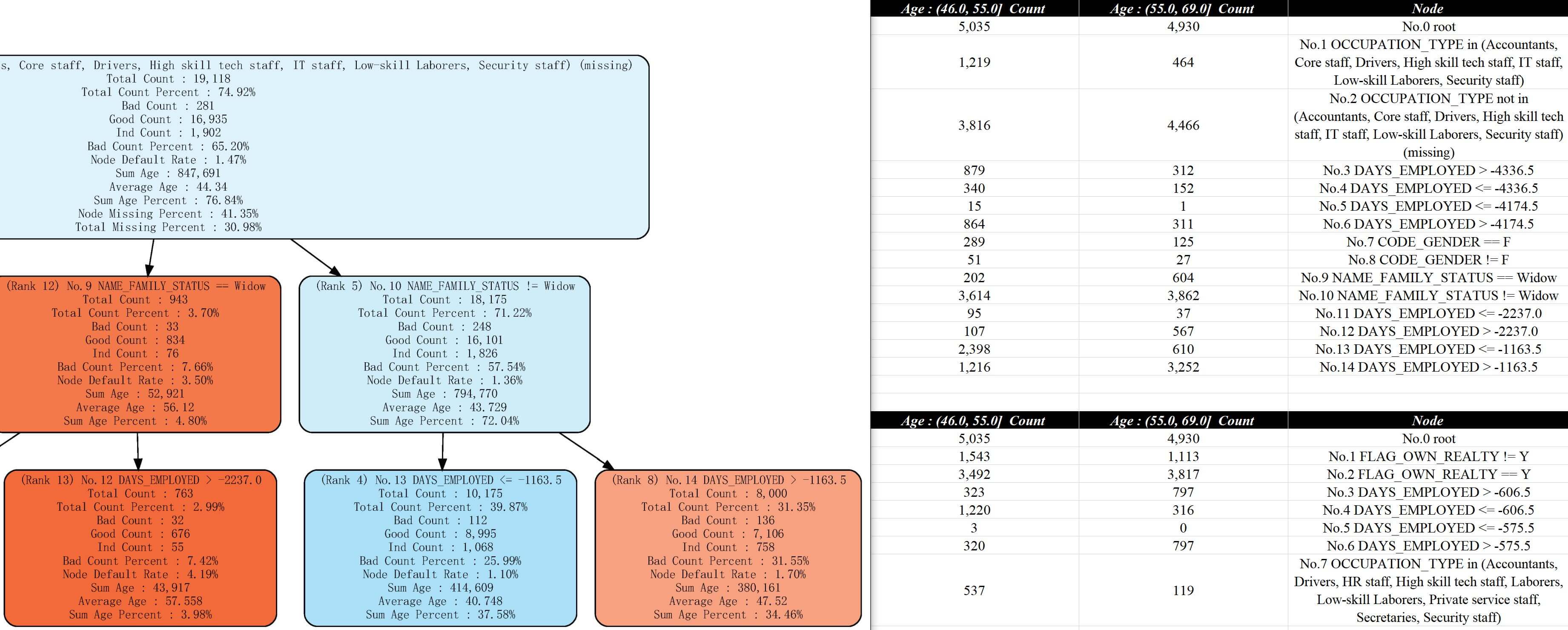 - 强可解释性:树模型天然的树结构,使得挖掘的规则在控制树深度的前提下具备了极强的可解释性,上面两条案例规则的解读就是最好的证明