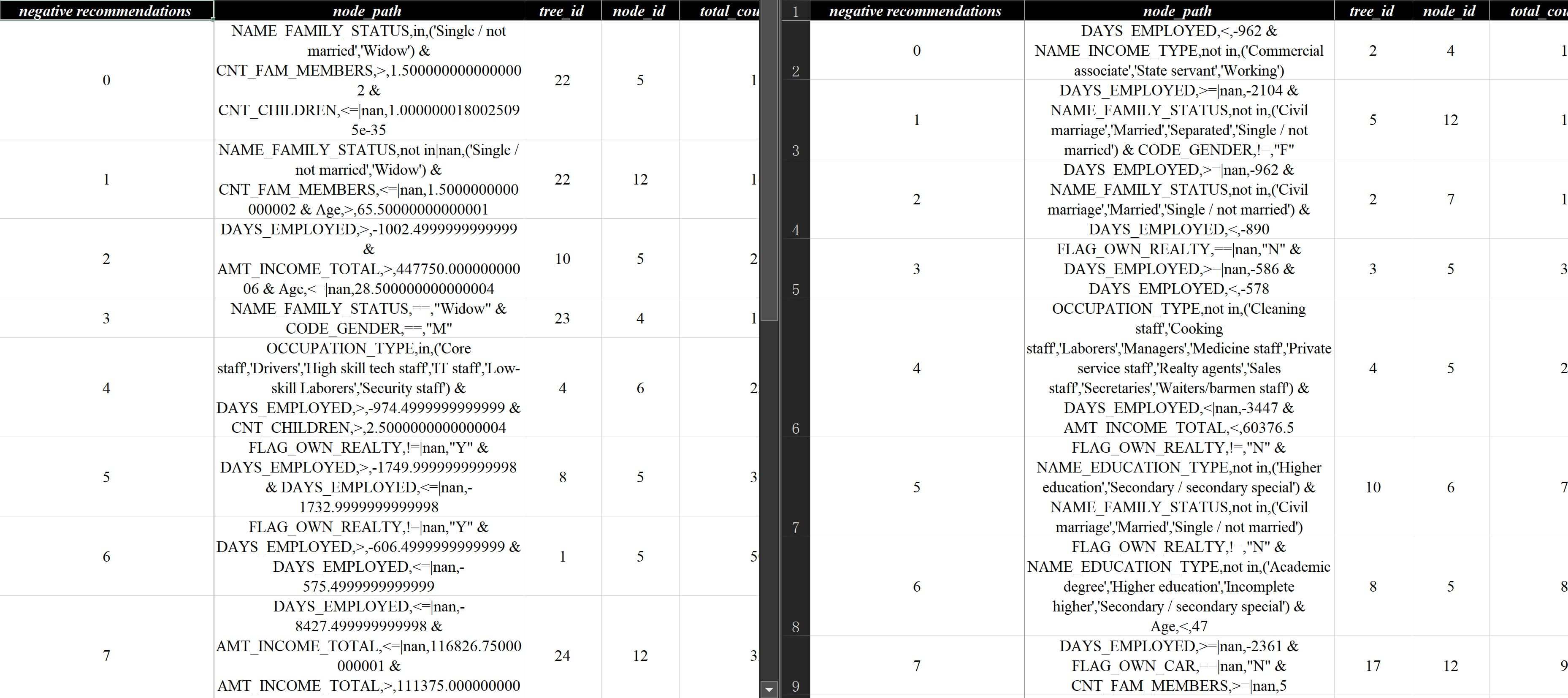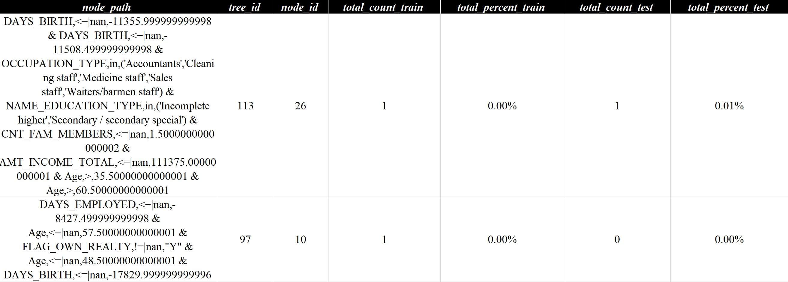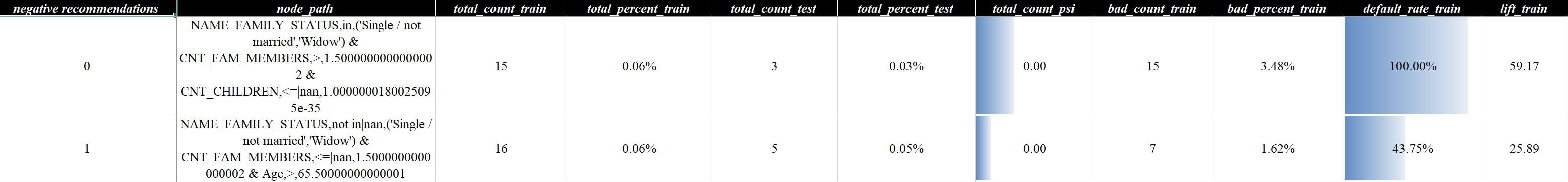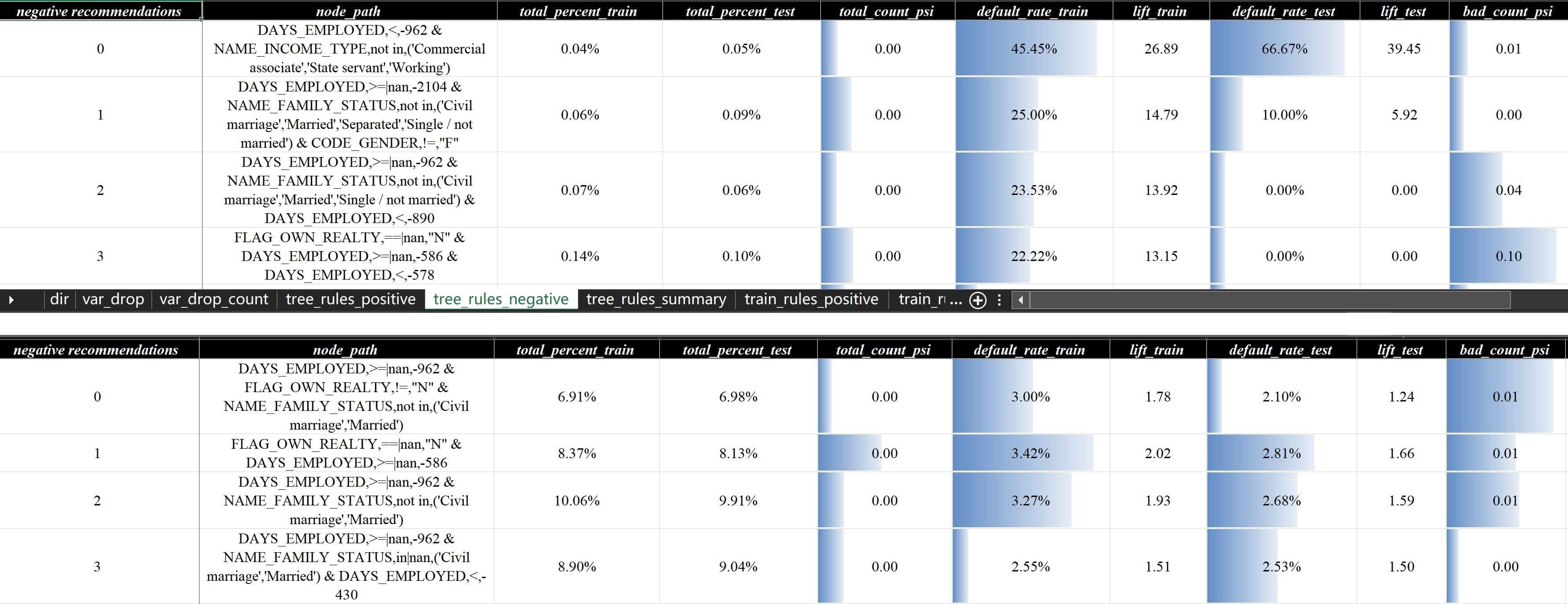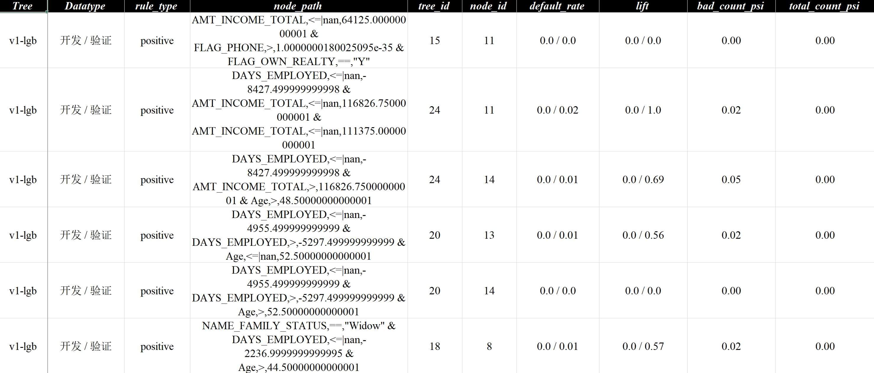 目前实现的自动化策略挖掘,能相当程度缓解上面提到的几个问题,比如从策略分析报告v1-lgb.xlsx中的规则评估 - 负向规则 - 汇总页面可以看到,前两条推荐的负向规则虽然命中较少,但坏客户命中率都很高,而且无论是分布还是有效性都较为稳定:/负向规则挖掘示例.jpg)