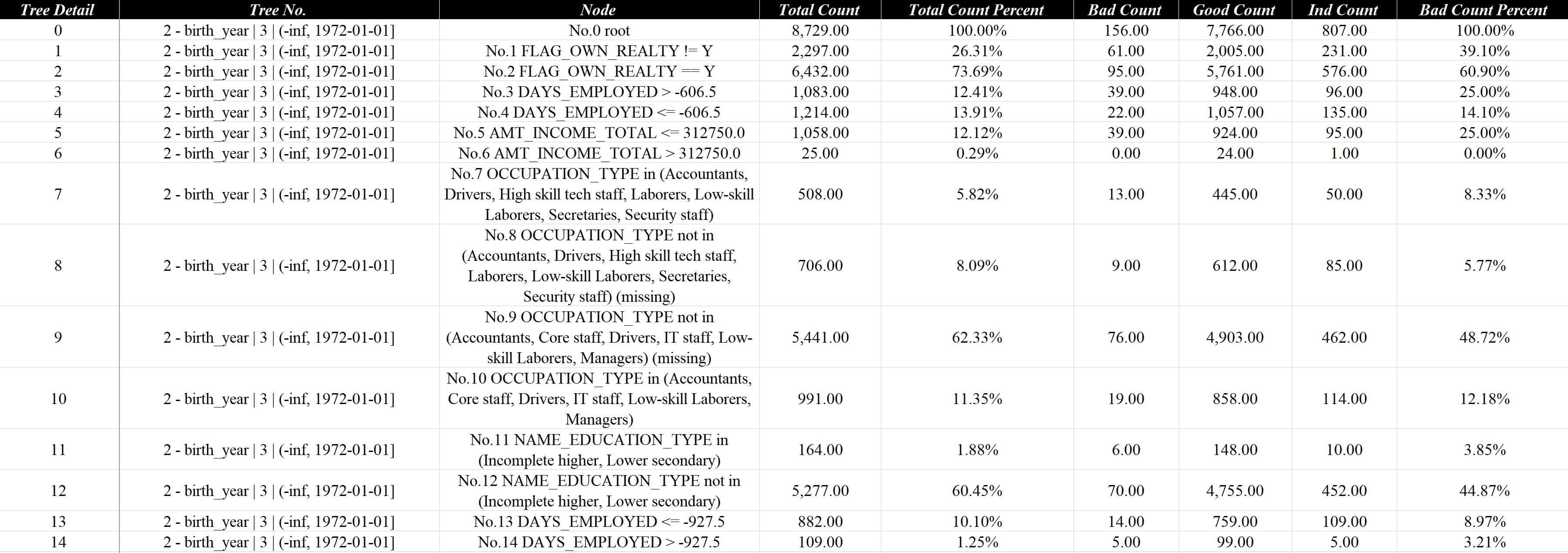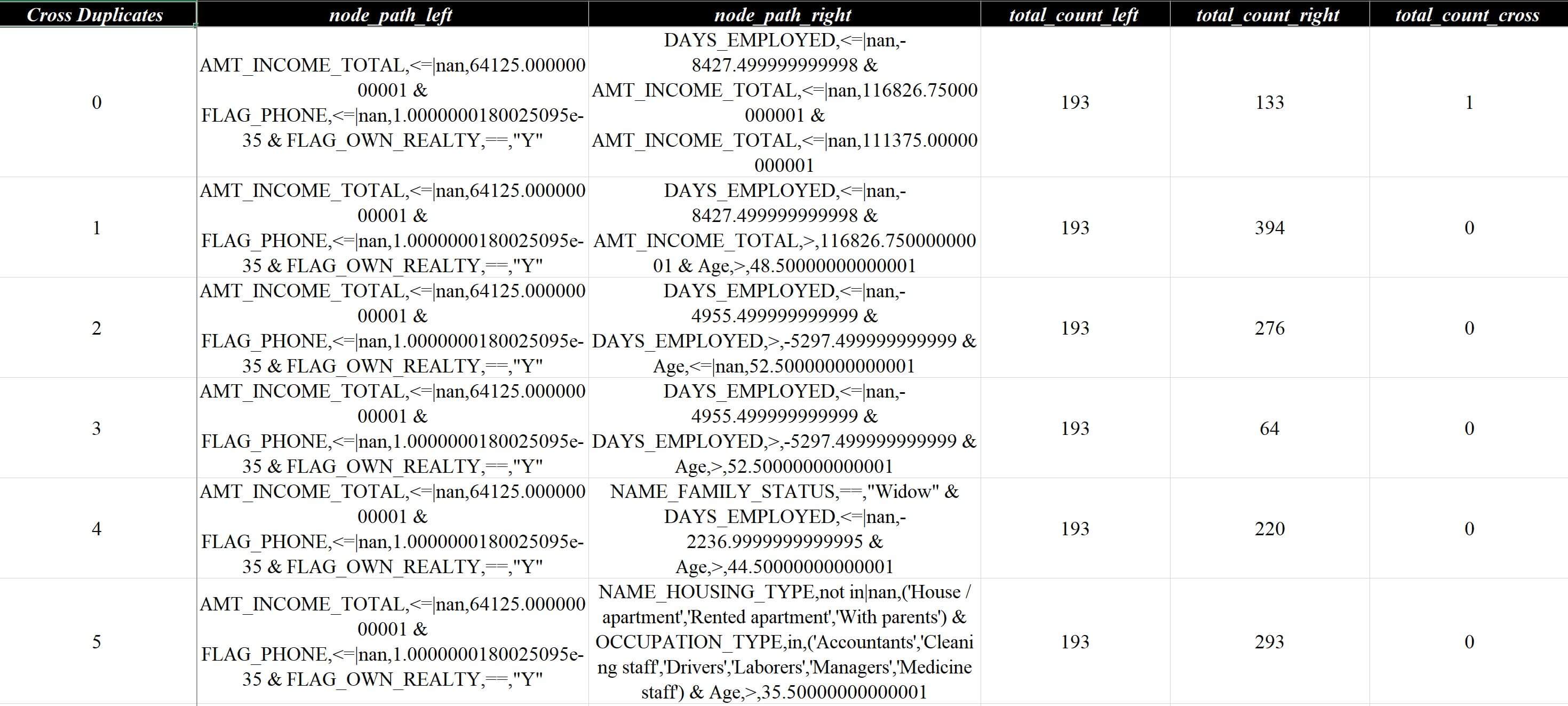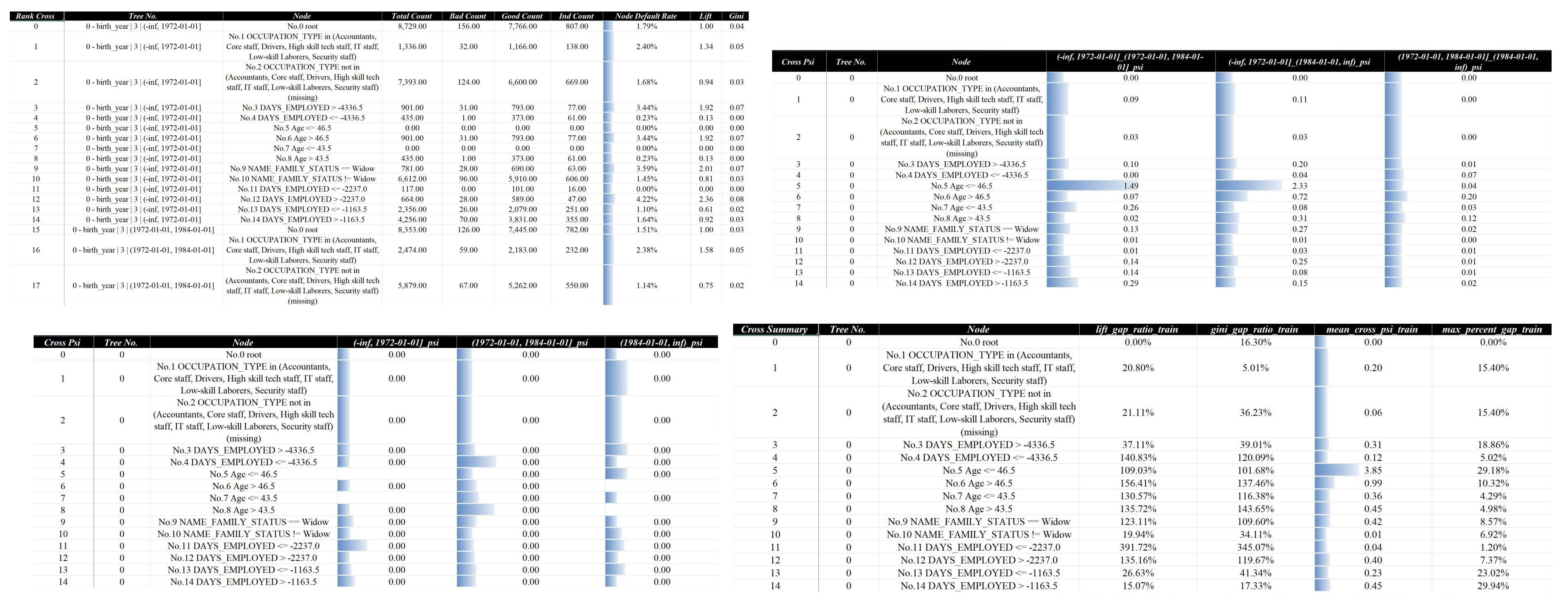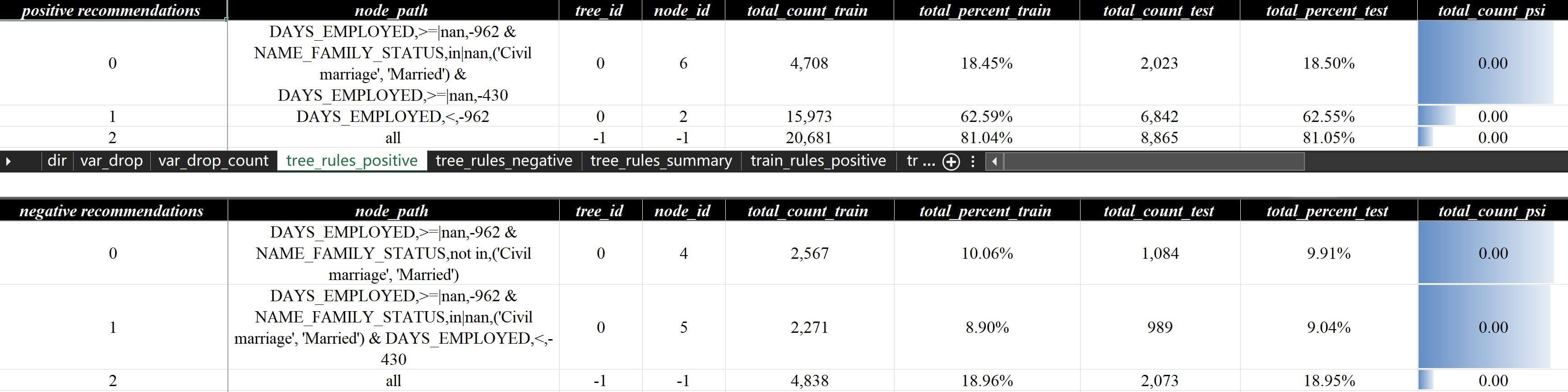 目前实现的自动化策略挖掘,能相当程度缓解上面提到的几个问题,比如从策略分析报告v1-lgb.xlsx中的规则评估 - 负向规则 - 汇总页面可以看到,前两条推荐的负向规则虽然命中较少,但坏客户命中率都很高,而且无论是分布还是有效性都较为稳定:/负向规则挖掘示例.jpg)